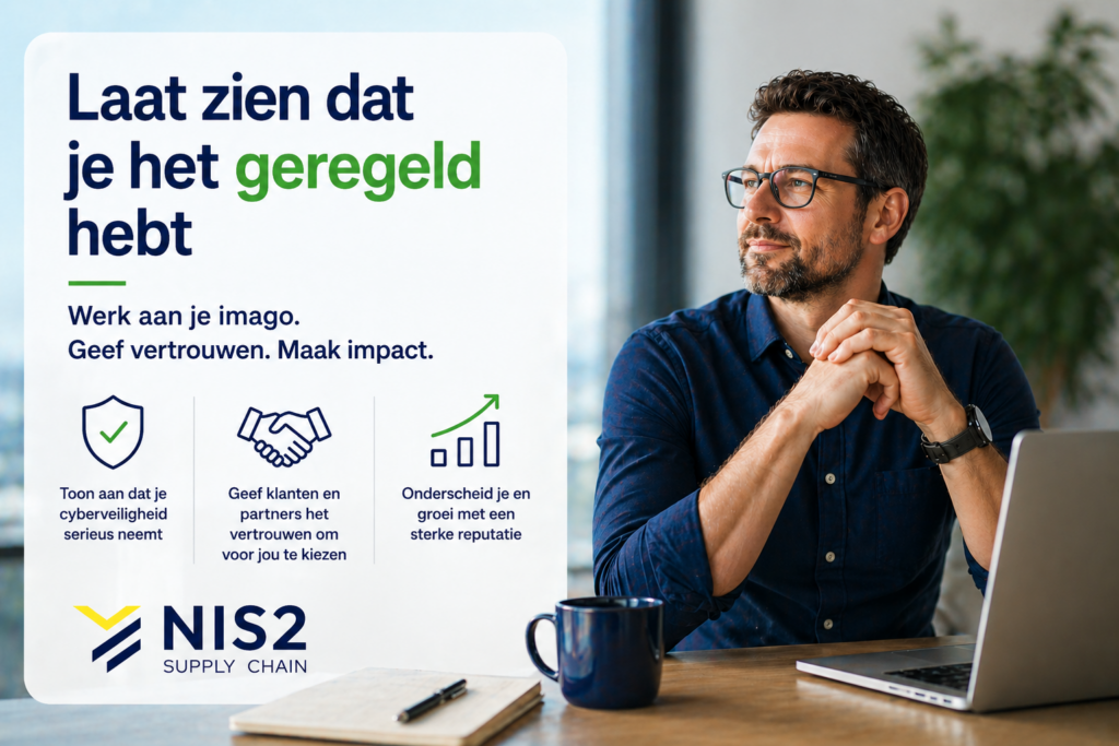 We zien steeds vaker dat bedrijven hun NIS2 Supply Chain-certificering actief delen op hun website, in offertes of op LinkedIn. Dit is omdat het werkt. Iedereen hoort over de NIS2 en jij laat zien dat je je bedrijf goed georganiseerd hebt. In steeds meer sectoren wordt aantoonbare cyberveiligheid onderdeel van professioneel ondernemerschap.
